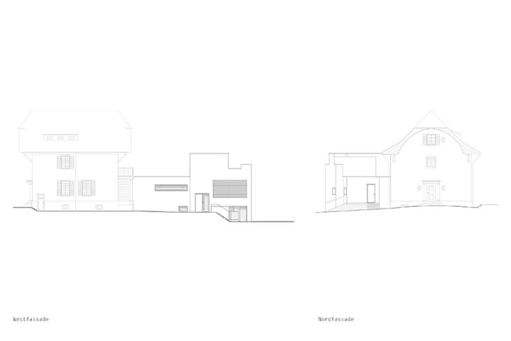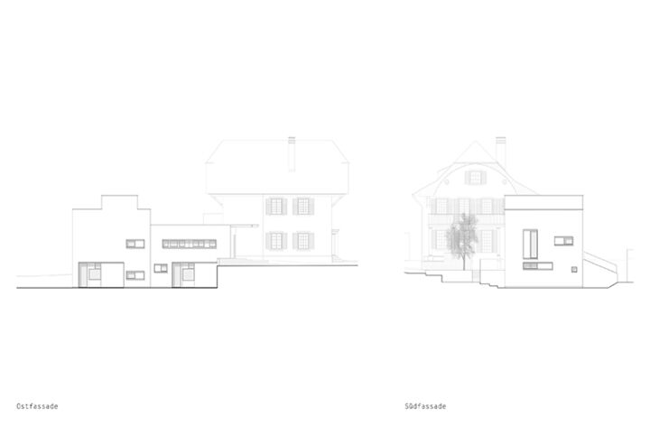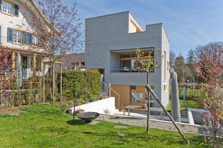 Ein Würfel von knapp sieben Metern Kantenlänge und ein Prisma schliessen die Parzelle auf der Ostseite ab. Ein Zusammenbau von Alt und Neu wird ausgeschlossen. Der Neubau ordnet sich in seinen Dimensionen dem Bestand eindeutig unter. Gleichzeitig erhält er jedoch aufgrund seiner kubisch-modernen Architektursprache und der eigenwilligen Materialisierung eine wohltuende Eigenständigkeit.