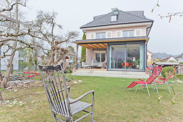 Weiter wurde das Erdgeschoss mit einem verglasten Anbau mit grosszügigem Vordach erweitert.