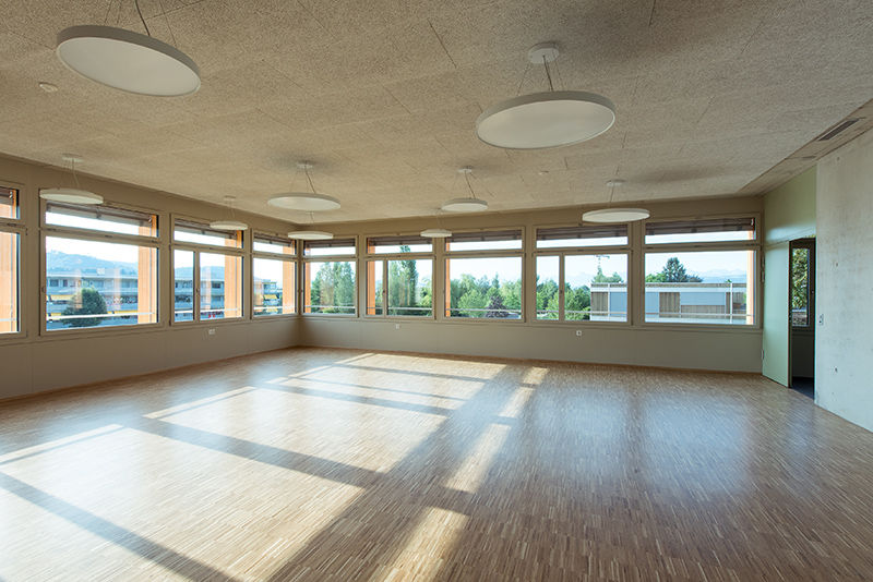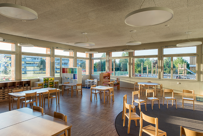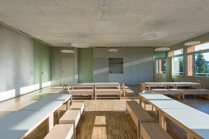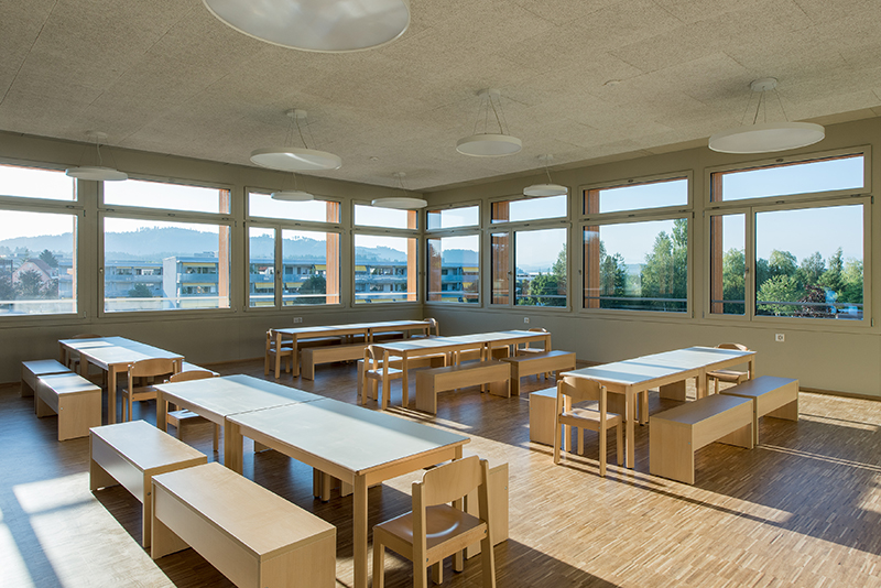 Das dreigeschossige Gebäude enthält auf jedem Stock je zwei Hauptschulräume mit je einem Gruppenraum. Im Gebäude sind diverse Büroräume, Sitzungszimmer und Schulküchen für die Nutzungen der Kindergärten, Schule und Tagesschule angeordnet.