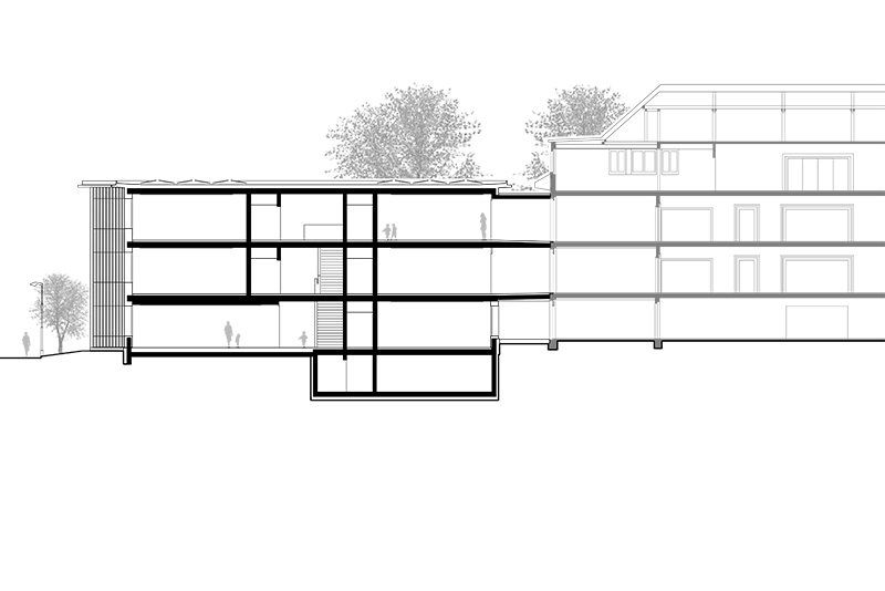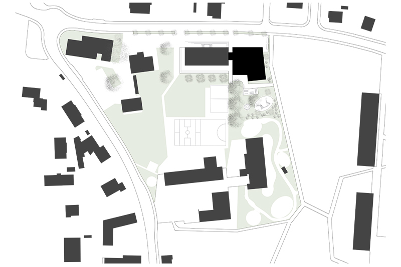 Das neue Gebäude markiert präzise den Eckpunkt zwischen dem Schulhaus Zentral und dem Kindergarten Häberlimatte im Süden. Die markanten Bäume, welche entlang dem Weg neben dem Sportplatz aufgereiht sind, bleiben somit erhalten. Ein Ausschnitt im neuen Volumen hält Abstand zum ersten Baum in dieser Reihe und bildet so eine eigene Hofsituation. Dieser Hof dient als separater Eingang für die Kindergärten im Erdgeschoss. So erhalten sie im Süden ihren eigenen Aussenraum mit einem grosszügigen Spielplatz mit Sand- und Wasserspielen und einem Holzgerüst zum Klettern und Balancieren.