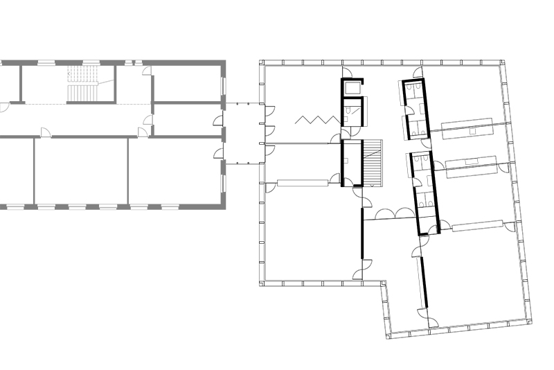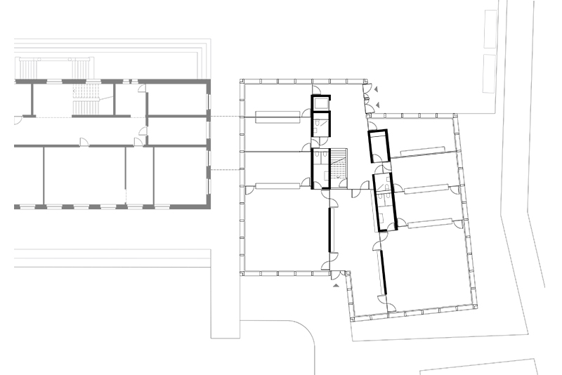 Der Neubau ist über eine zweigeschossige Passerelle an den denkmalgeschützten Bestandesbau angeschlossen.